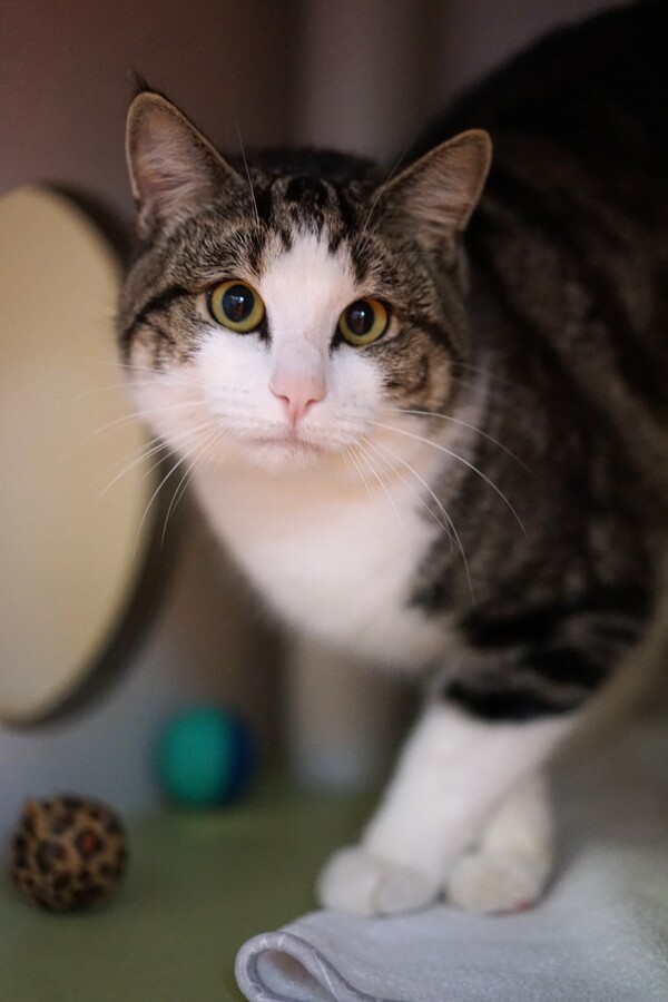Marvin came to us via the council, and while we don't know much about his past, it's clear he's been through a lot. Understandably, he was a bit scared when he first arrived at the shelter. With time and patience, sweet Marvin has started to come out of his shell. He's still a little shy, but if you go slow, he'll pop his head out for a pat and a cheek scratch-his absolute favorite! Marvin loves his food, gentle affection, and having a cozy spot to retreat to when he needs quiet time. He's ready for a kind, patient forever home.