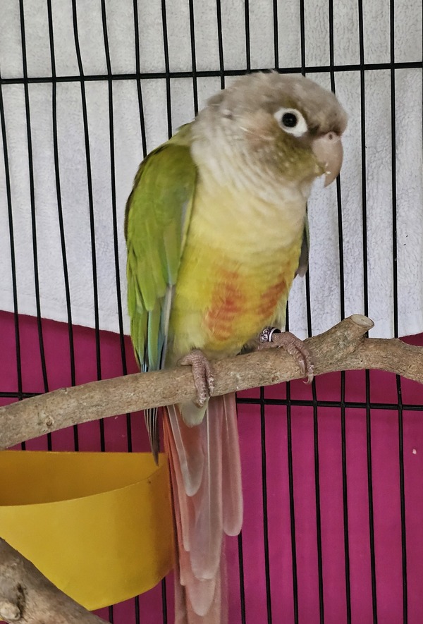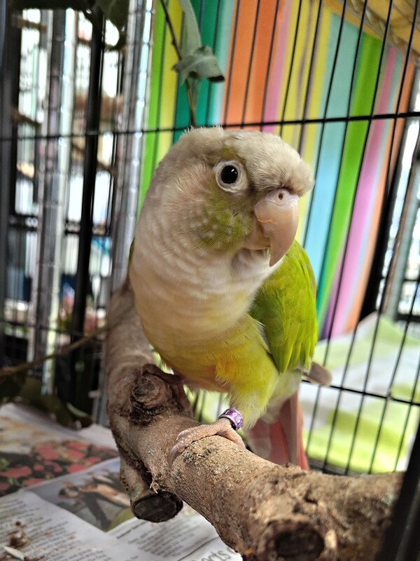 Green cheek conures are known for being intelligent, curious, and full of character-and Baxter is no exception. While we're still getting to know his individual quirks, he's shown interest in his surroundings and is eager to observe the world around him. With time, patience, and gentle interaction, Baxter has the potential to thrive and become a wonderful companion.