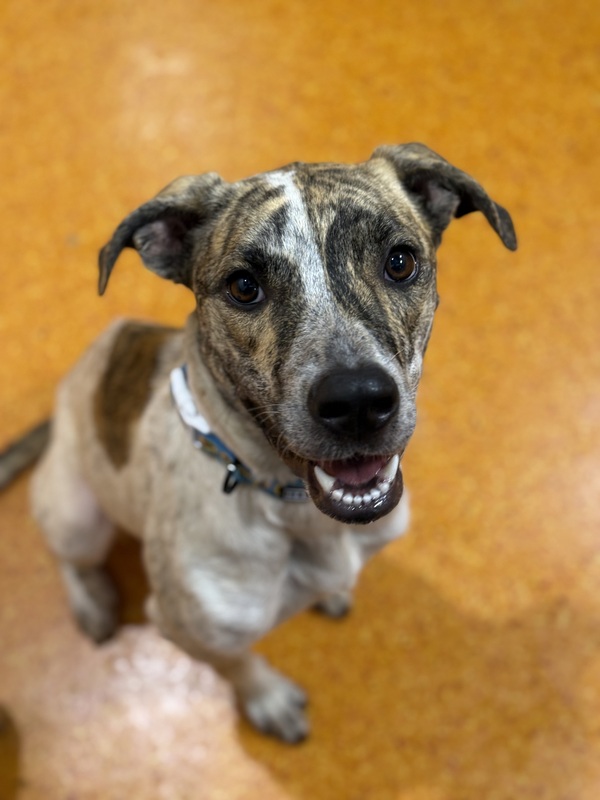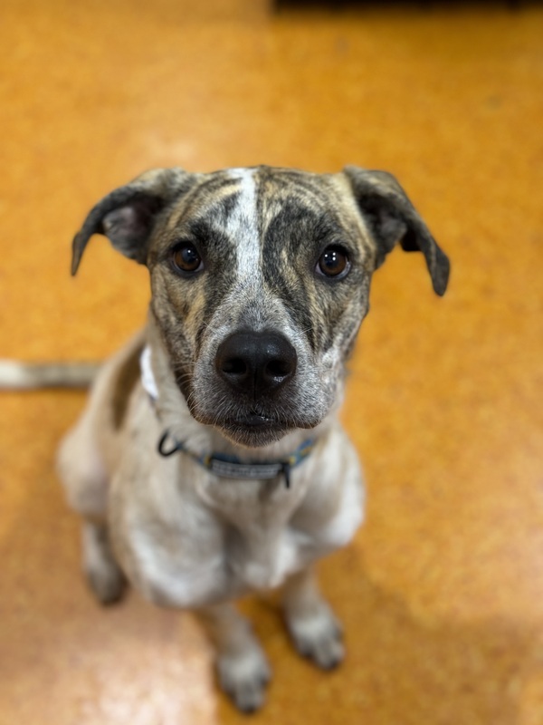 She must meet any resident dogs at the time of adoption. Dominique has shown a playful and social side during dog meets, though she can be a bit enthusiastic - so a tolerant, friendly canine companion could be a great match to help her feel more at ease.