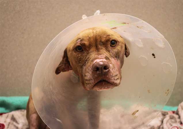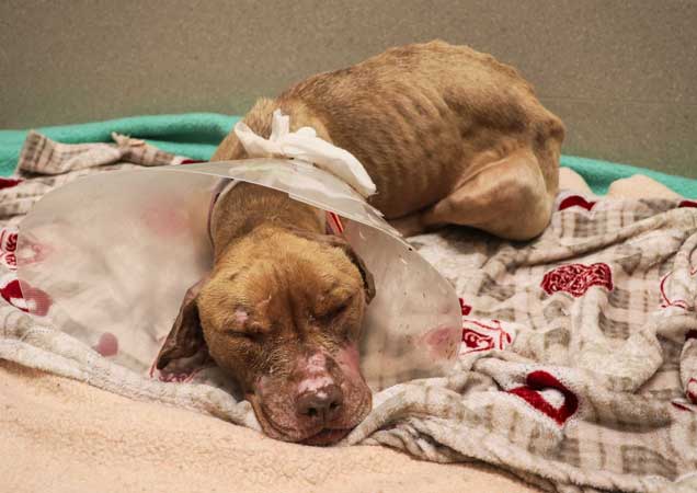 Ivy’s head was swollen, her face and body covered in sore, open bite marks. Infected fluid was seeping from her ears, and she was limping. This sweet-natured three-year-old Staffy cross was also severely underweight.