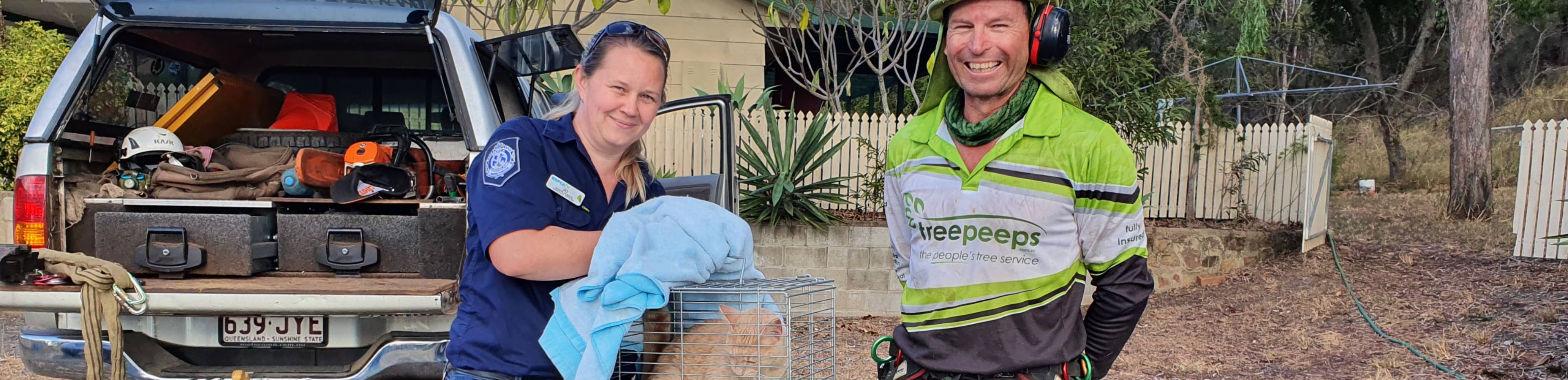 Rescue officers with rescued cat