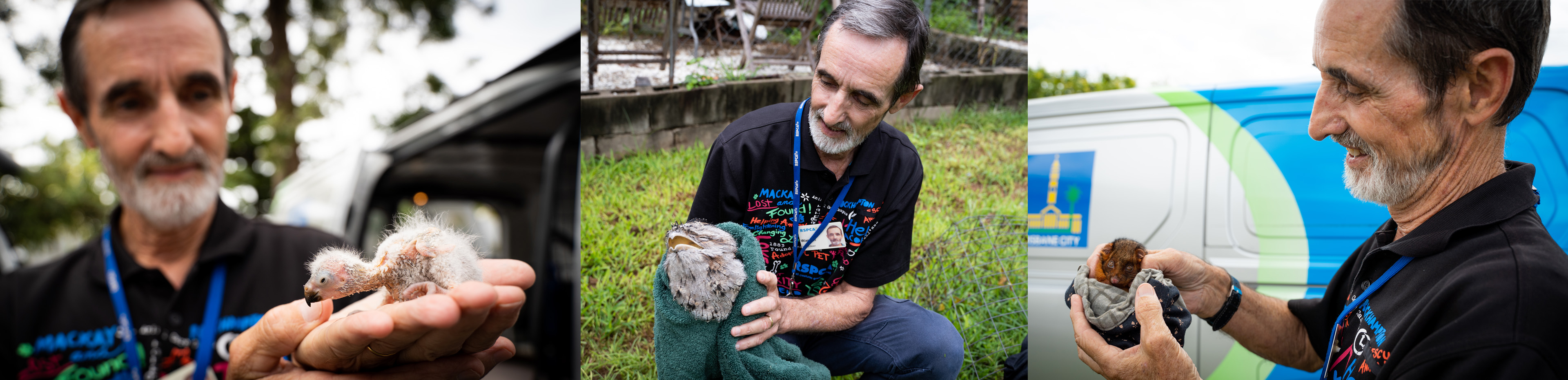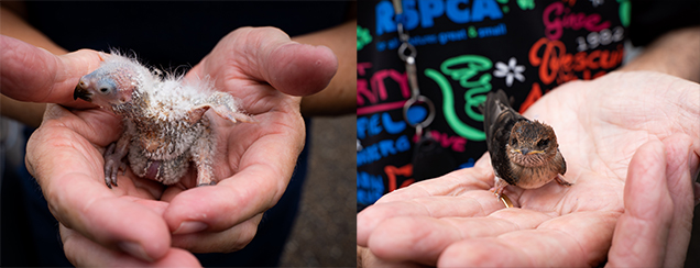 Next, Warren heads to Highgate Hill where a sick tawny frogmouth is unwilling to move in someone’s backyard and needs to be rescued. Lots of birds were swooping it and it still didn’t want to go anywhere, so something was clearly wrong. It’s clear once Warren picked the bird up that it was quite unwell, so Warren rushes the bird back to our Wildlife Hospital with the other birds he has rescued already.