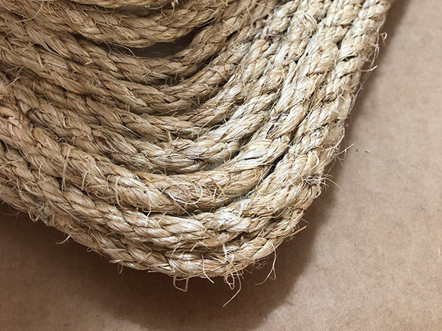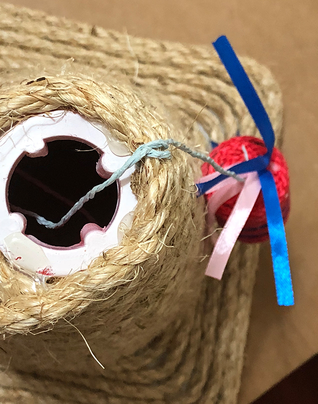 When you get to the top of the cone, tie a piece of string to a cat toy and then tie the other end around the sisal rope. Glue both down. Continue wrapping the rope around the very top, then stick the remaining end into the opening to hide it.