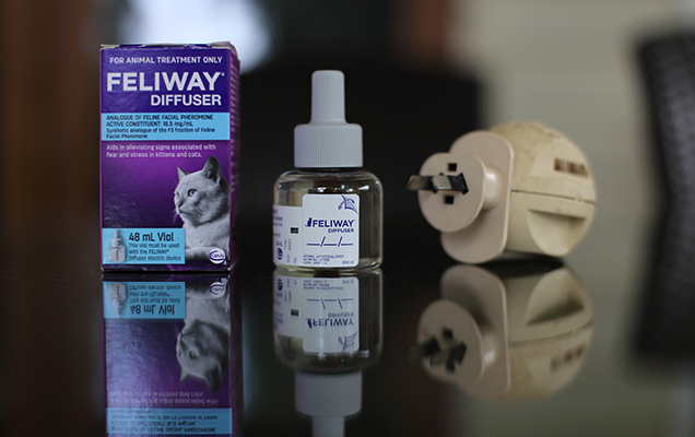 When a cat rubs its face and cheeks along objects, it is actually marking that object with a homing pheromone that reassures them they are in their own safe space. A Feliway diffuser or spray can be used when bringing a new cat home, moving house, travelling or for vet visits. Some cats, despite not being in a new environment, can be highly anxious. Use of the Feliway facial pheromone can provide a sense of security helping reduce urine spraying and hiding while increasing food intake and normal grooming behavior.