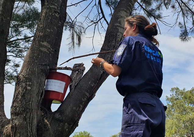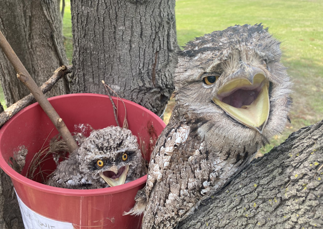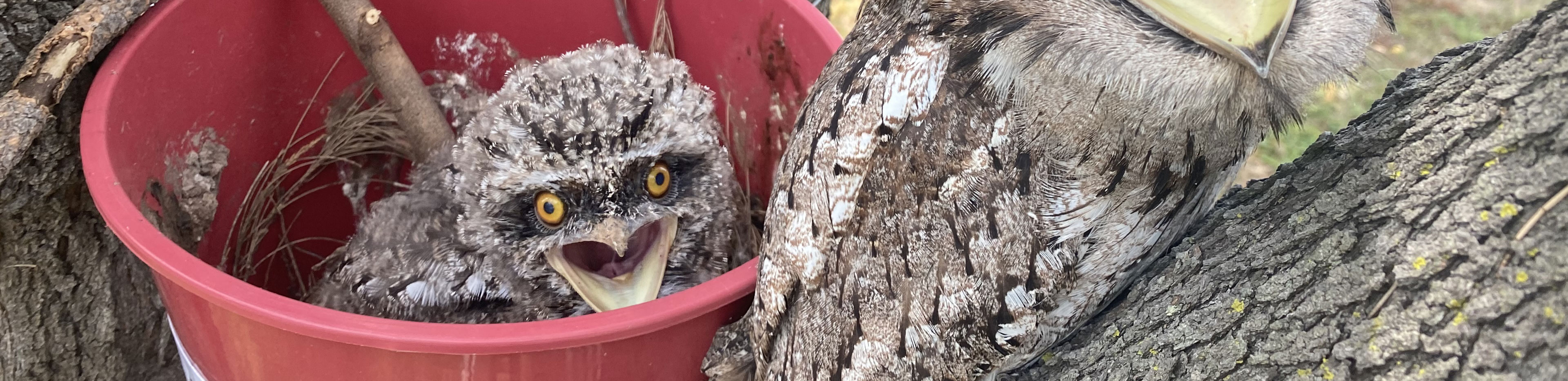 Recently, a tawny was found in Yeerongpilly lying on the floor and not moving. When Rescue Officer Sam picked up the tawny, a baby tawny was revealed underneath her! The baby tawny had fallen out of the tree as the nest was unstable and her Mumma was trying to protect her. Sam got to work on a makeshift nest that was more stable in the tree.